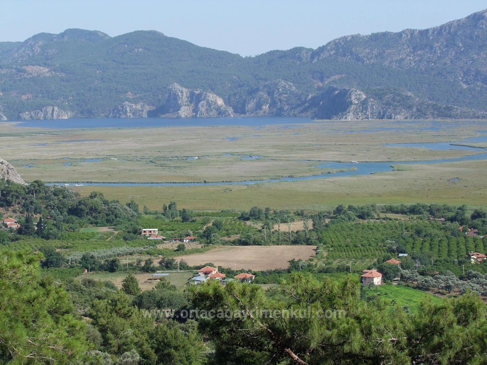 A 1252 m2 share of a 26300 m2 plot of land within the village settlement area in Çandır neighborhood of Köyceğiz is for sale. The sale is subject to a voluntary partition. There are no problems with roads, water, or electricity. The land has a lake view from the ground. İztuzu Beach is visible from the building. It is suitable for future investment. The land is 3km from Dalyan center, 28km from the airport, and 34km from Köyceğiz. The price is: 5,250,000 TL