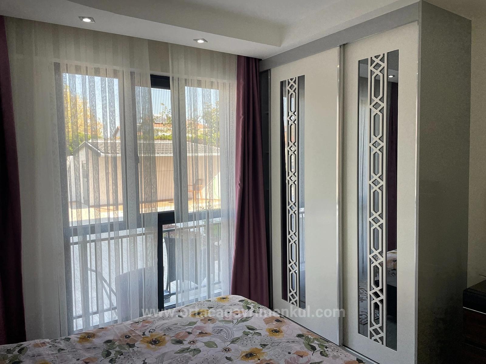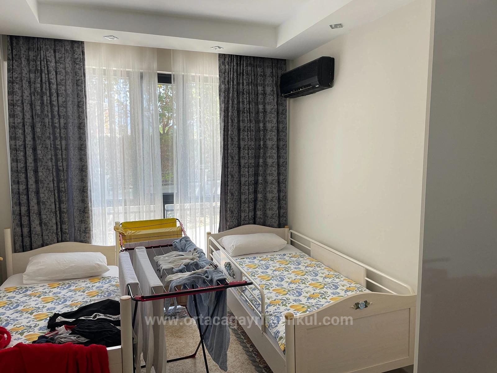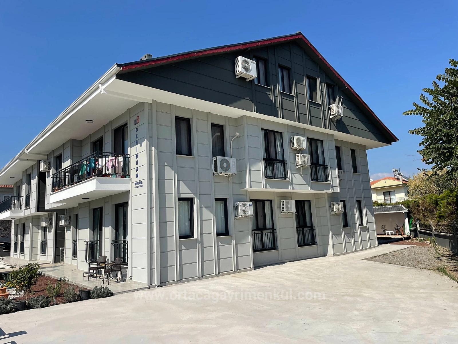 A ground floor apartment is for sale in a building with 8 apartments on a 1000m2 plot in the center of Dalyan. It has 2 bedrooms, 1 living room with open kitchen, and 1 bathroom, totaling 75 m2 of usable space. It is fully furnished. It is a new building and requires no renovations. It has a shared outdoor swimming pool. It is within walking distance of shopping markets. The apartment is 10 km from Iztuzu Beach and 25 km from the airport. The price is: 210,000 EURO