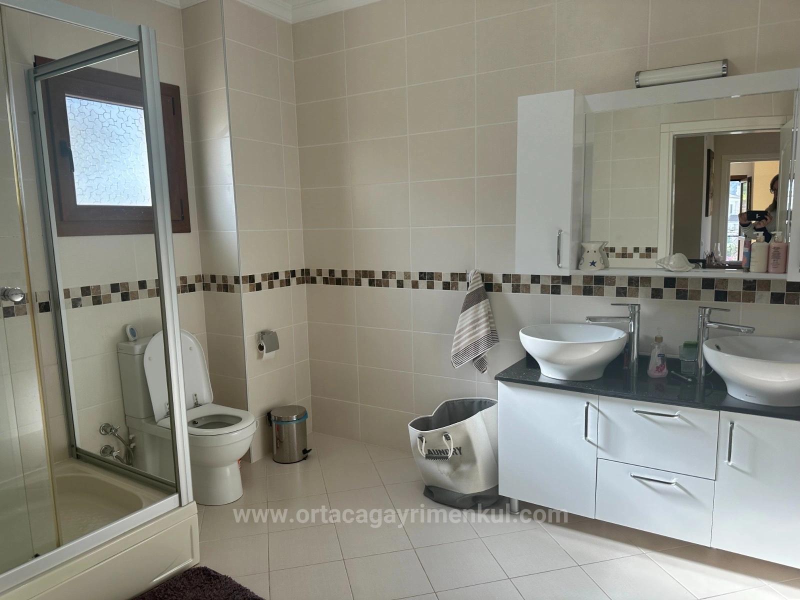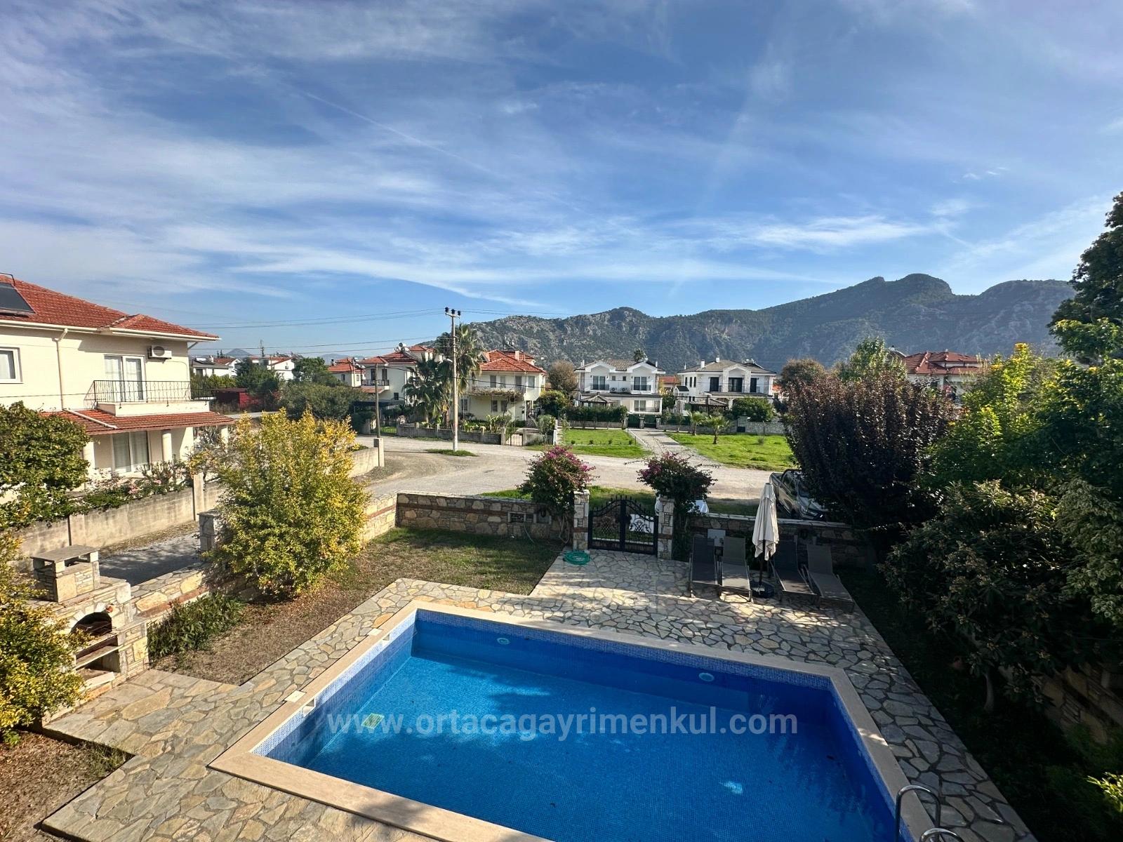 A villa on a 500m2 plot is for sale on a corner near the center of Dalyan. It has 4 bedrooms, 1 living room, open kitchen, 2 shared bathrooms and 1 en-suite bathroom. There is a bedroom on the ground floor. There is a detached outdoor swimming pool and barbecue. Every room is air conditioned. It is fully furnished and has a fireplace. It is within walking distance to shopping markets and the neighborhood market. The price of the villa, which is 10km from Iztuzu Beach and 25km from the airport: 410,000 GBP