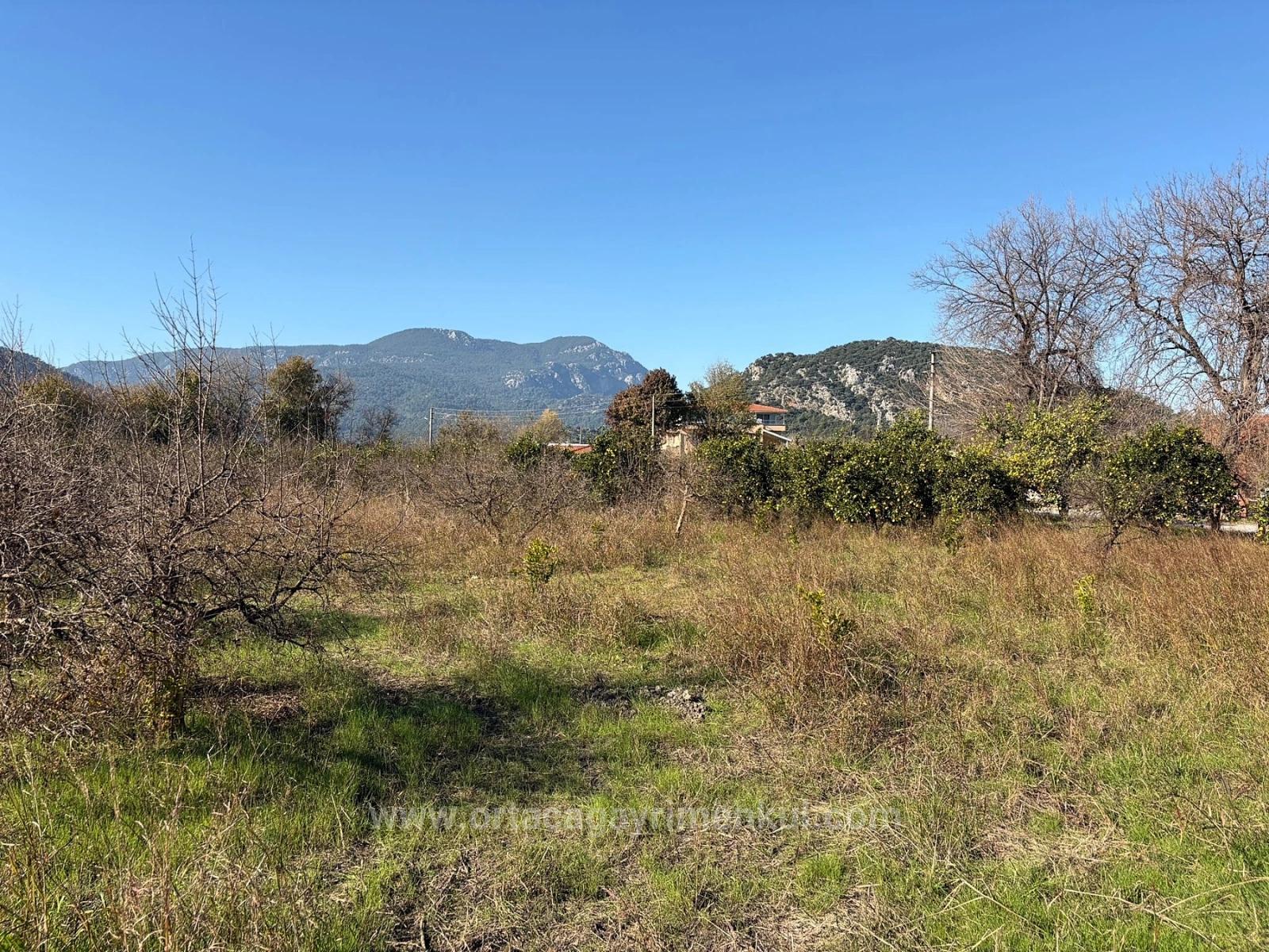 A corner plot of 4,541 m2 garden is for sale in Dalyan, close to the center. It contains various fruit trees. There are no problems with road access, water, electricity, or telephone. It is close to the boundaries of the zoning plan. It is suitable for future investment. The land is 1.5 km from the center, 11 km from Iztuzu Beach, and 25 km from the airport. The price is 25,000,000 TL