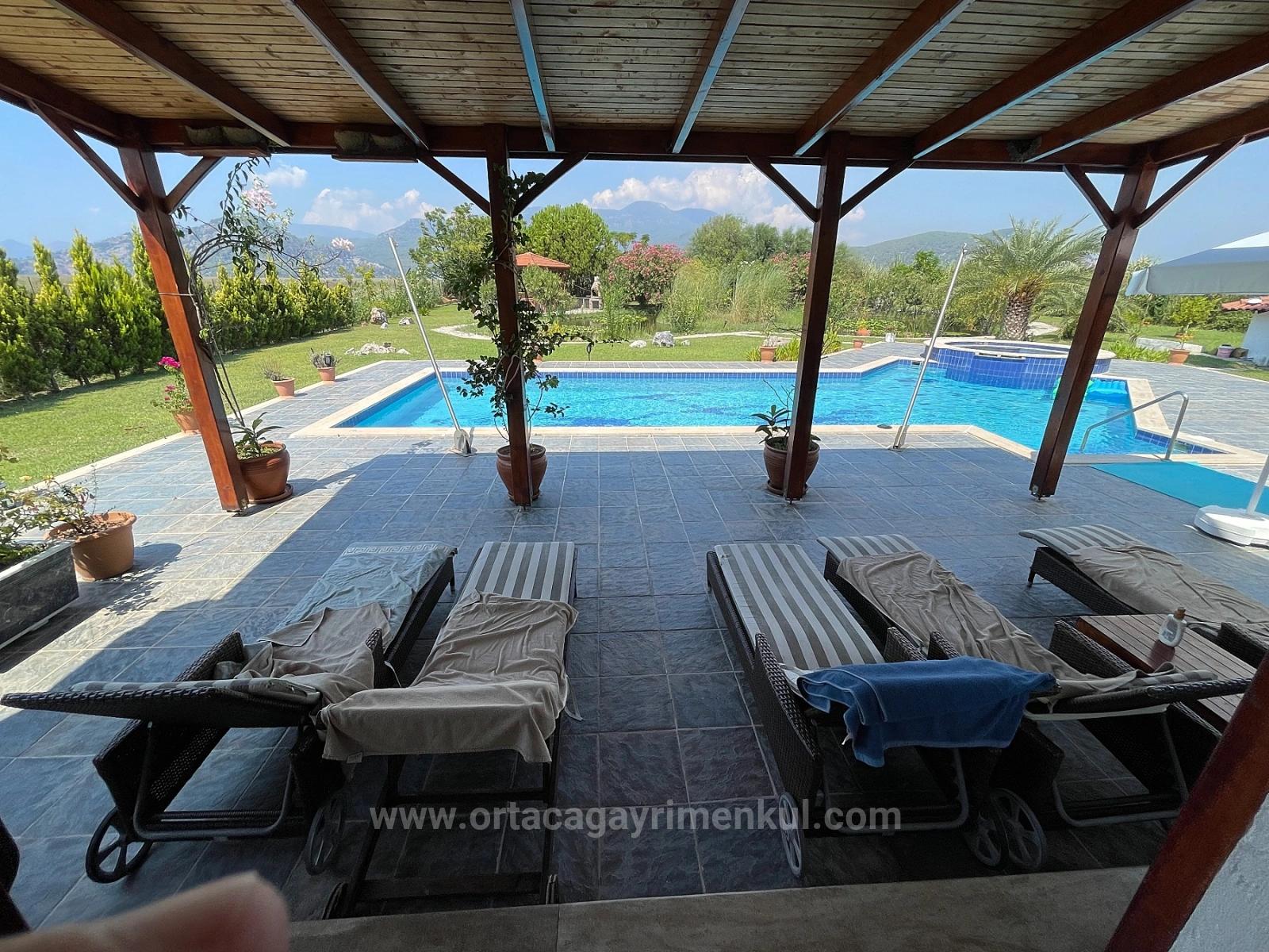 Dalyan İztuzu plaj yolu tarafında 7,000m2 arsa içerisinde 4 yatak odalı 1 salon şömüneli + mutfak bağımsız 4 banyolu full eşyalı herşey yenilenmiş her odanın kiliması vardır tüm beyez eşyaları yenidir. özel müstakil tuzlu su sistemli açık yüzme havuzlu ayrıca villanın önünde yapayı balıklı göl vardır. hahçe dizaynı yapılmı dişarıda bar bükü ve kamalya köşkü vardır. villanın geliş balkonu ve teraslıdır. hiç masrafı yoktur alış veriş ve sent pazarında 5 dk iztuzu plajına 8 km havaalanına 25 km mesafesi olan villa iztuzu ve kral mezarları manzaralıdır. fiyatı: 1,100,000GBP