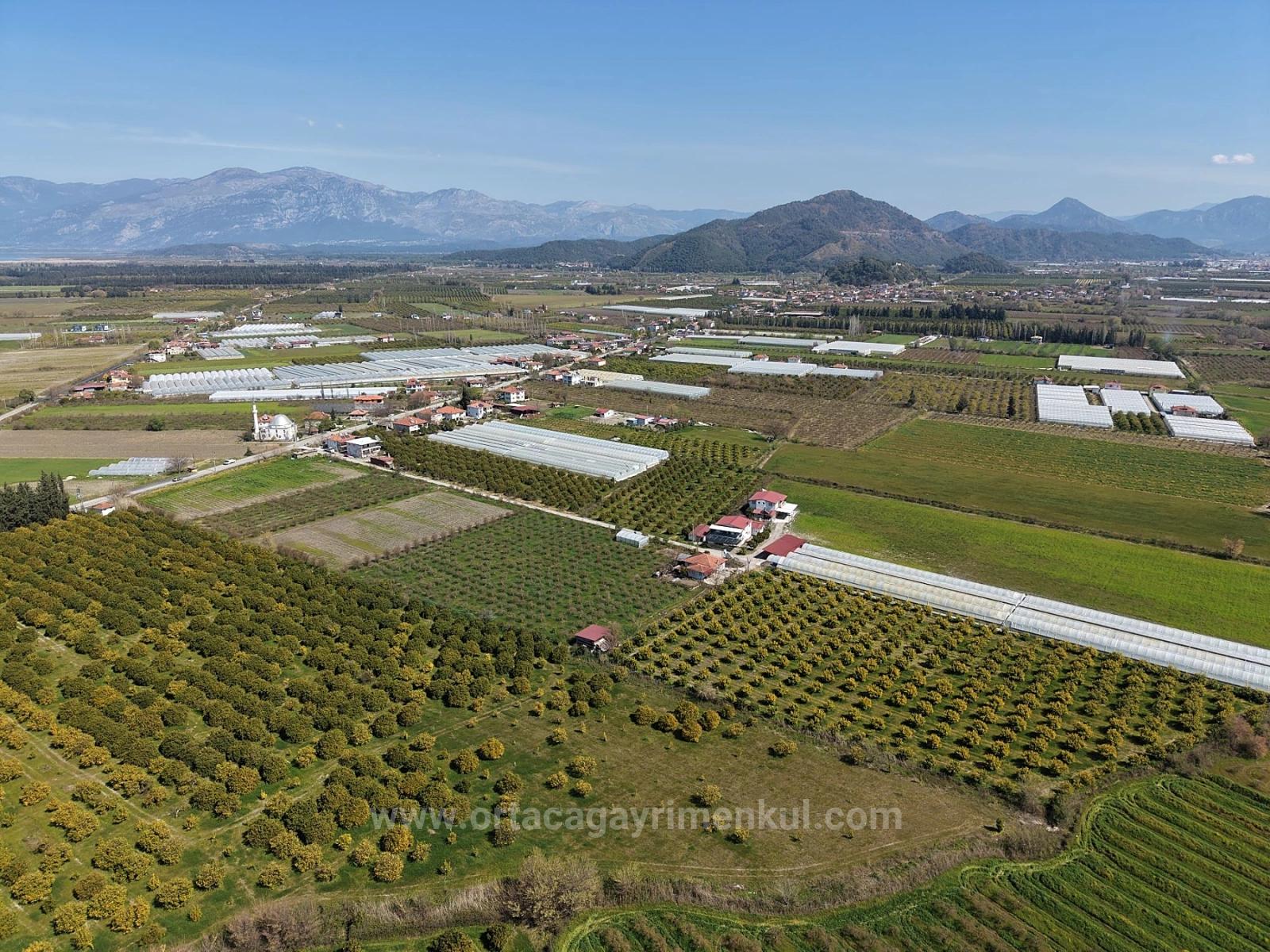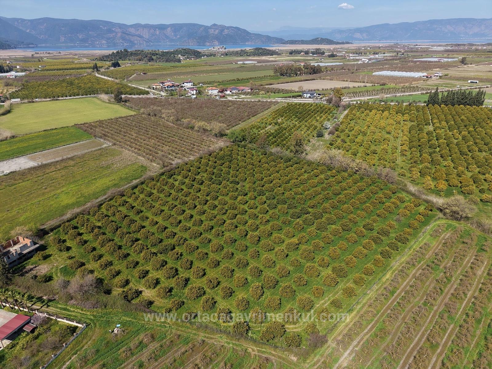 Dalyan merkeze yakın 17.550m2 narenciye bahçesi satılıktır. İçerisinde yaklaşık 200m2 yapı kayıt belgeli bina bulunmaktadır. Yol, su, elektrik, telefon sorunu yoktur. Yıllık meyve getirisi 60-70 tona yakındır. Etrafında yapılaşmalar mevcuttur. Bina tadilat ruhsatı ile düzenlenebilir. Dalyan merkeze 2 km, İztuzu Plajı'na 12 km, havaalanına 25 km mesafesi olan bahçenin fiyatı: 1.650.000 Dolar