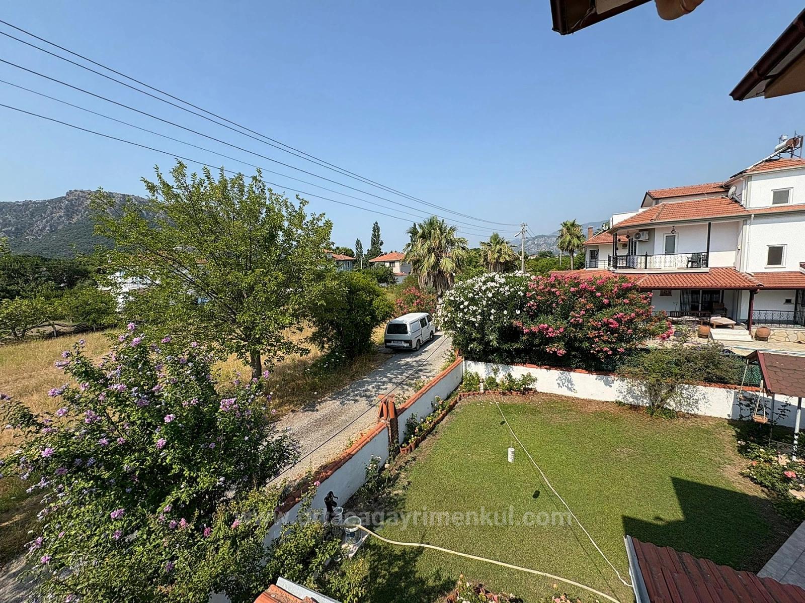 Okçular'da 514 m2 arsa içerisinde 2 katlı müstakil ev satılıktır. Ev bağımsız alt-üst 2 daireden oluşmaktadır. Giriş katı 3 yatak odalı, 1 salon, 1 mutfak, 1 banyolu ve teraslıdır. İkinci kat ise 3 yatak odalı, 1 salon, 1 mutfak, 1 banyo, 2 adet balkonu vardır. Bir balkonun şöminesi ve oturma grubu bulunmaktadır. Açık otopark, depo ve bahçe sulamak için sondaj vardır. Ayrıca bahçe içerisinde çeşitli meyve ağaçları bulunmaktadır. Dalyan merkeze 3km, alışveriş marketlerine yürüme mesafesinde, İztuzu Plajı'na 13km, havaalanına 26km mesafesi olan evlerin fiyatı: 19.000.000 TL